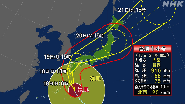 それより、台風14号の勢力が強い上に、日本列島直撃らしい。