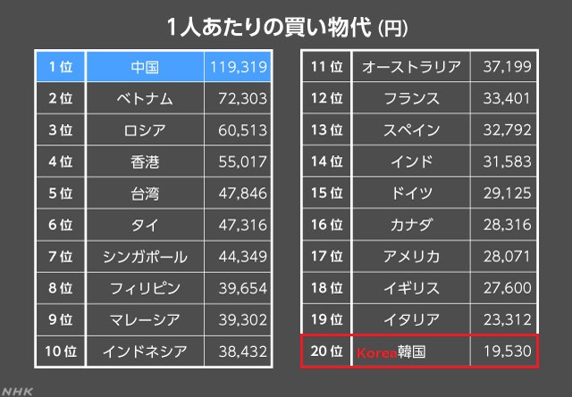 それほど大きく違っていないな。韓国人の使う旅行費はほかの外国人の1/2程度。既出だが