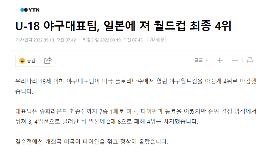 韓国は19日(韓国時間)米国フロリダ州サラソタエドスミススタジアムで開かれたU18野球ワールドカップ3位決定戦で日本に2-6になった。