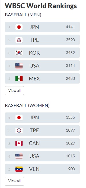 しかし、現在の日本の世界ランキングは男子野球1位、女子野球1位。