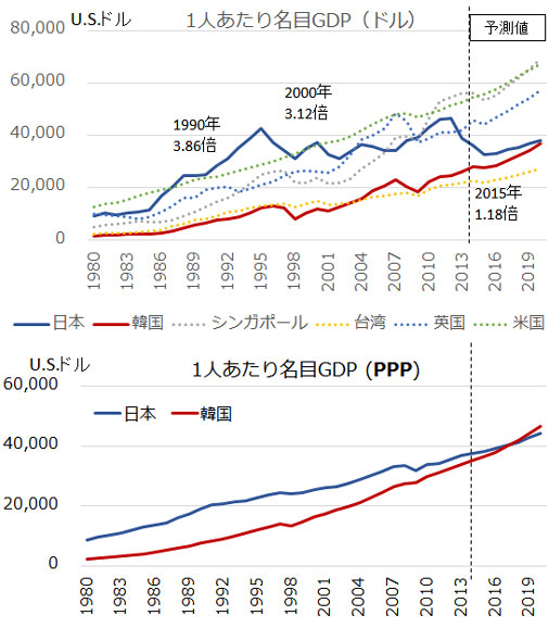 한국의 1인당 명목 GDP가 2020년에는 일본과 거의 같아진다는 결과가, IMF의 추계 (World Economic Outlook Databases (October 06, 2015))에 게재되어, 놀라움과 함께 보도되고 있는 듯 하다.