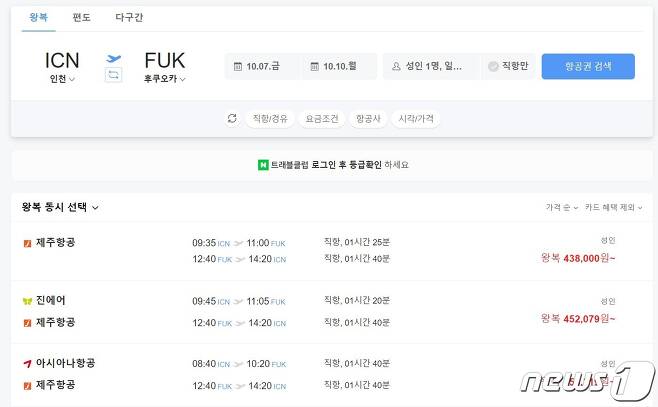 16日ネイバー航空券から10月7日出発して10日に戻る3泊4日日程の「仁川~福岡」往復航空券を検索した結果、最低価格が43万8000ウォンだ。