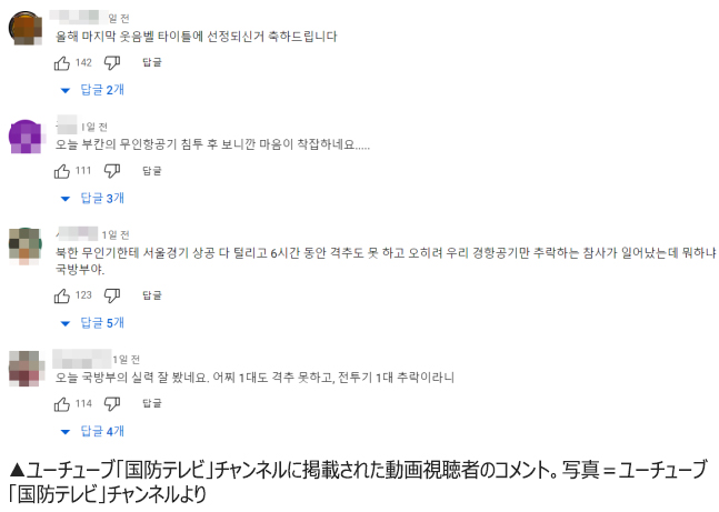 韓国国防部の所属機関「国防広報院」の面目が丸つぶれになった。このほど動画共有サイト「ユーチューブ」で「無人機の天敵」だとして地上配備型対空兵器「飛虎複合」を広報したのにもかかわらず、26日に韓国領空が北朝鮮の無人機(ドローン)5機によって侵犯されたからだ。動画を掲載してから十日しかたっていなかった。韓国軍は戦闘機と攻撃型ヘリコプターを出撃させたが、北朝鮮の無人機を1機も撃墜できなかった。こうしたことが報道されたことから、該当の動画には広報とは違う韓国軍の対応に失望したというコメントが殺到している。