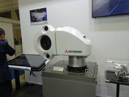 三菱重工は今回、出力10kWの固体レーザーを使用する撃墜システムを展示した。レーザーには、加工などに使われている固体レーザーの一種である「ファイバーレーザー」を使う。コアに希土類元素のYb(イッテルビウム)をドープした光ファイバーを増幅媒体として利用する装置である。レーザーの波長は近赤外域の1μm帯で、射程は1.2kmだという。