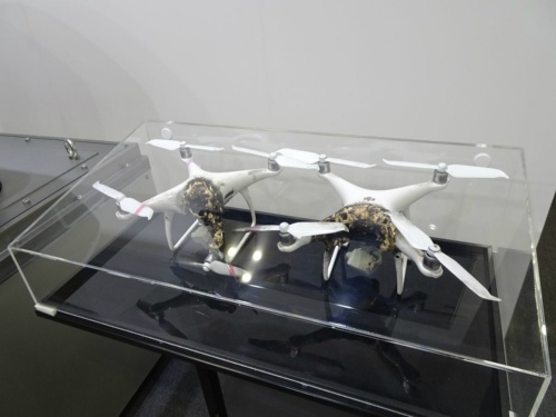 同社のブースではドローンを撃墜するテストの模様を撮影したビデオを流し、実際に撃ち落としたドローンも展示した。なお、大気中の水分によるレーザー光の吸収の影響については、「ある程度の降雨では大きな問題はないが、霧やもやの影響については今後確認する」(説明員)としている。- 21