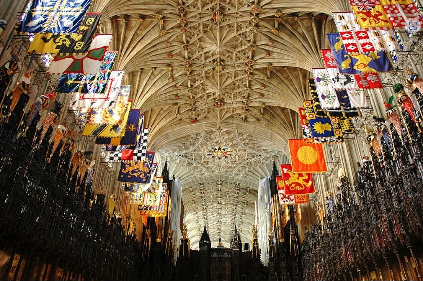 エリザベス女王の葬儀中継でも、ウィンザー城の聖ジョージ礼拝堂に掲げられたガーター勲爵士のバナー。右後方に、誇らしく皇室の菊花紋章が見えたな。