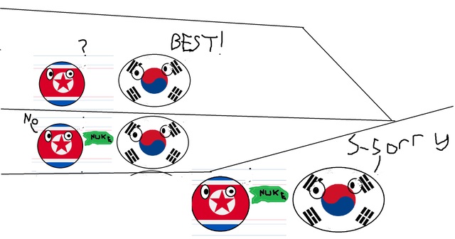 北朝鮮に対しては直接「Best Korea は韓国だ」と言えない韓国の図。(ポーランドボール)かつては北朝鮮よりも貧しい世界最貧国