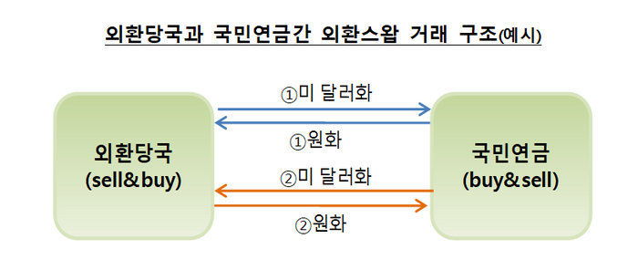 外国為替当局は、外国為替スワップ取引が外国為替市場の不安定な時、国民年金の現物為替買入需要を吸収できるものと見ている。 これに対し、外国為替市場の安定に貢献できるものと期待している。