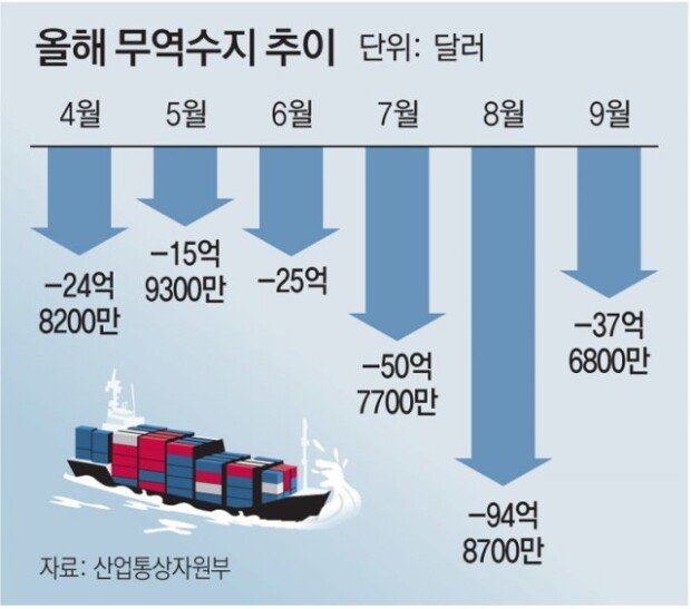 9月の貿易収支が5兆ウォン以上の赤字を記録し、貿易赤字が6ヵ月連続続いた。6ヵ月連続の赤字を記録したのは、1997年に国際通貨基金(IMF)から救済金融を受けた通貨危機以来25年ぶりのことだ。今年の年間貿易赤字の規模は500億ドルに迫り、史上最大になるという分析も出ている。韓国経済の成長エンジンである貿易が揺らぎ、景気低迷への懸念が高まっている。