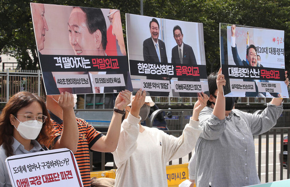ソウルキョレハナ(同胞は一つ)の会員たちが26日午後、ソウル市龍山区 (ヨンサング)の大統領室前で記者会見を開き、27日に開かれる予定の日本の安倍晋三元首相の国葬への韓国政府代表団の派遣撤回を要求した。