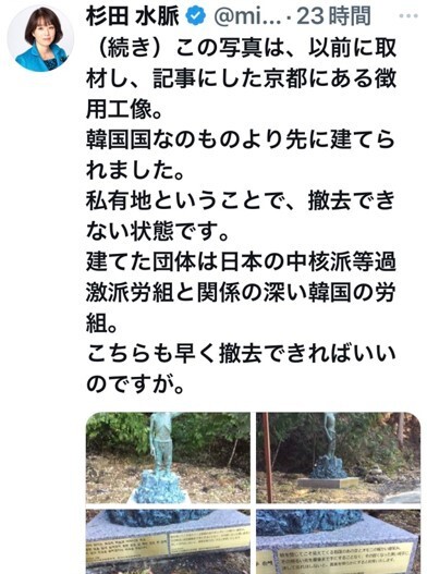 さらに、日本が朝鮮半島に対して犯した過ちを記憶するために作った別の記念物を次の目標として提示した。杉田氏は京都府に作られた「日帝強制労働朝鮮人労働者像」の写真4枚をアップし、「この写真は、京都にある徴用工像。韓国のものより先に建てられました。私有地ということで撤去できない状態です。これも早く撤去できればいいのですが」と述べた。杉田氏が指摘した追悼像は、2016年に韓国労総と民主労総が京都の丹波マンガン鉱山に建てた「日帝強制労働朝鮮人労働者像」だ。当時、韓国の二大労総は強制動員労働者の人権蹂躙(じゅうりん)の実態を知らせ、被害者の名誉を回復するためにこの銅像を建てた。現在、ソウル、仁川、慶尚南道、済州などにも同じ労働者像が設置されている。