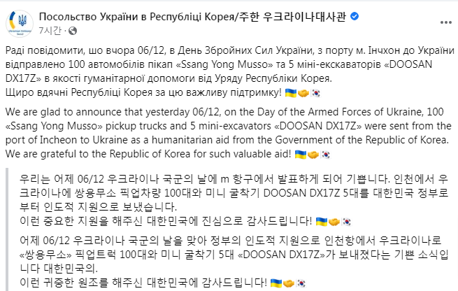 韓国政府と国会によると、韓国政府は今年2月末に戦争が起こって以来、ウクライナから対空ミサイルや対戦車ミサイルなどの支援要請を常に受けてきた。しかし韓国政府はウクライナに対して「武器支援は不可能」との考えを伝えてきた。その代わりに韓国政府は防弾ヘルメット、テント、毛布、戦闘用食料などの軍需品や医薬品などの人道支援を行っている。これまで韓国政府は総額1億ドル(約130億円)以上の人道支援を国際機関などを通じてウクライナに行ってきた。