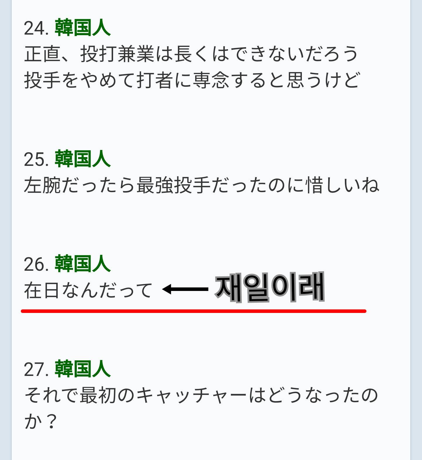 どうしても話題に入りたいなら、他国のサッカー選手やアイドルの話しなんかしないで、韓国人メジャーリーガーの例を出して比較しようね>>73