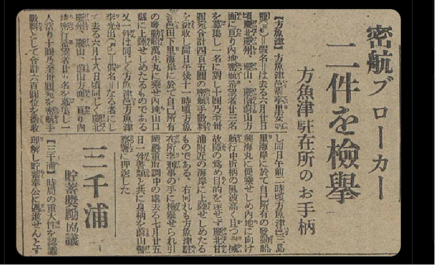 朝鮮から内地への密航ブローカーが逮捕された記事。密航希望者から10円から30円を受け取り、自己所有の船で密航を企てた朝鮮人ブローカーが朝鮮人刑事の活躍により2件同時摘発。