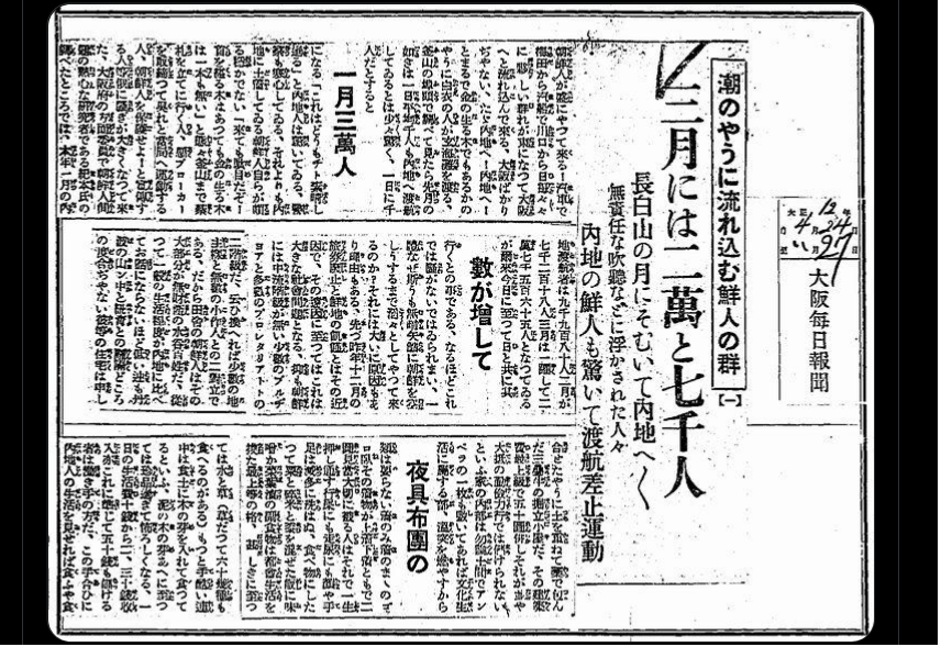 大正12年、朝鮮半島から月に3万人も内地に朝鮮人が押し寄せてくるために、内地の先住朝鮮人が渡航差し止め運動を始めたという記事。