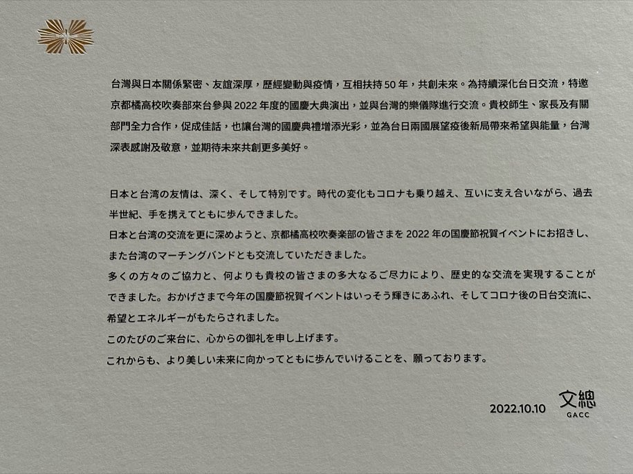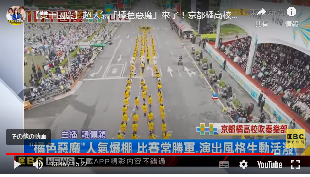 双十節の式典に海外の大規模な楽団が招待されるのは初めて。台湾メディアによると、衣装の色から「オレンジの悪魔」と呼ばれ、台湾にもファンがいる同校吹奏楽部の演奏を担当者がインターネットを通じ視聴したことが、招待のきっかけとなった。台湾と日本の友情を世界に示したい考えもあるという。