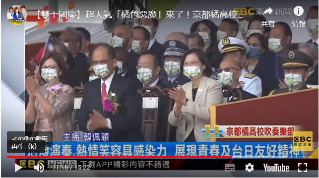 台北時事】マーチングバンドの強豪として知られる京都橘高校(京都市伏見区)吹奏楽部が、10日に台北市で開催される台湾の双十節(建国記念日)式典に招かれパフォーマンスを披露する。蔡英文総統は7日、フェイスブックで「式典のハイライトの一つだ」と大きな期待を示した。