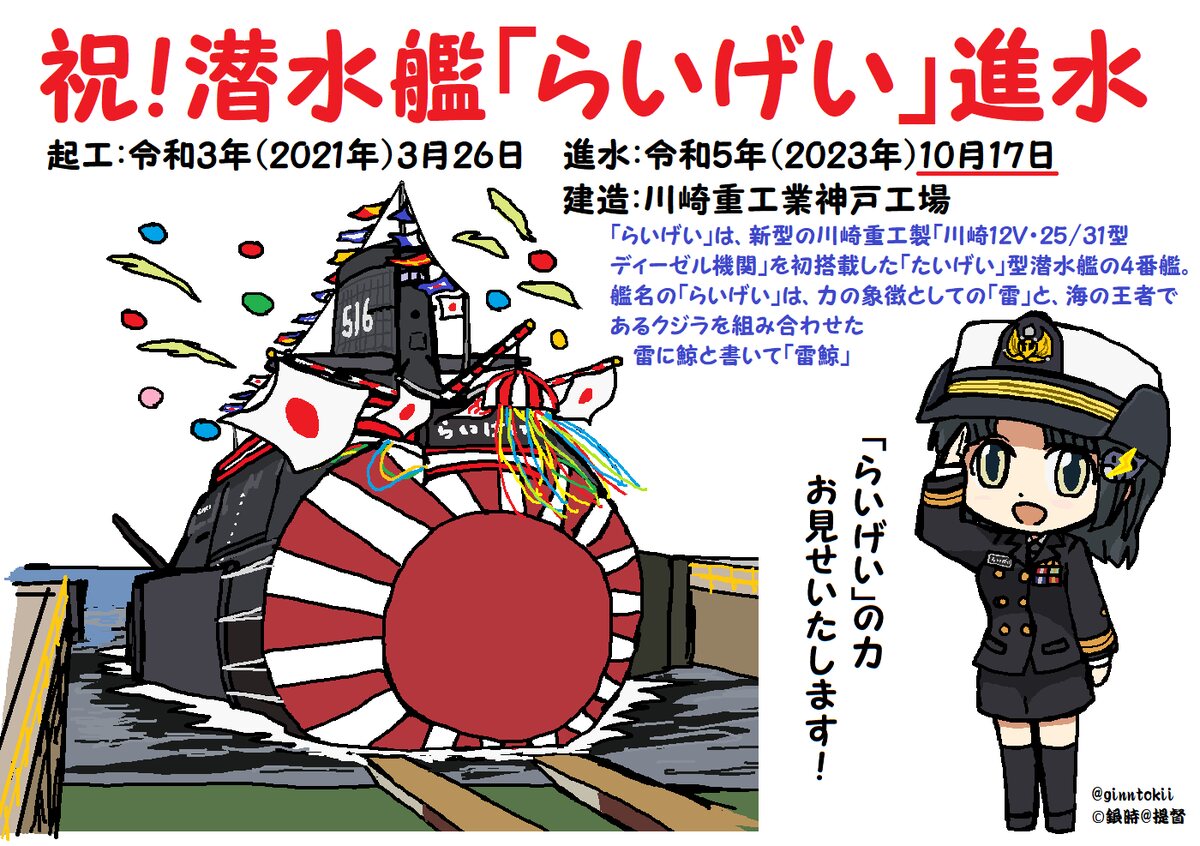 海上幕僚監部広報室によると、じんげいは令和4年3月に就役したたいげい型潜水艦の3番艦で、基準排水量約3千トン、全長約84メートル、乗員約70人で、建造費は約699億円。