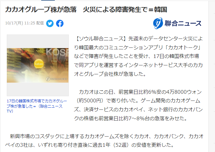 韓国で発生した通信アプリ「カカオトーク」の障害が大きな批判を生んだ。