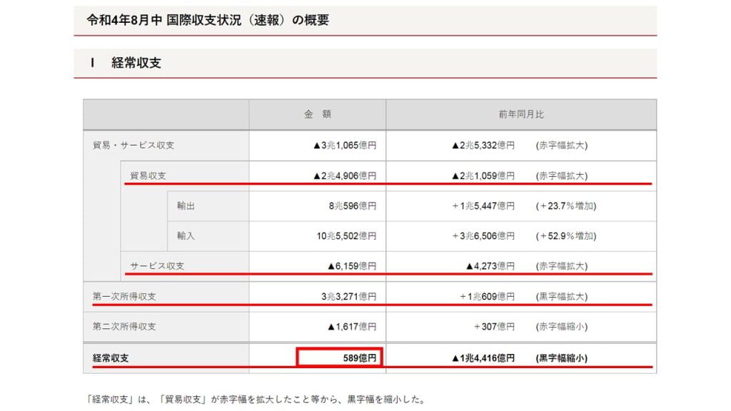 01~08月の累計貿易収支は「-9兆3,890億円」と大赤字です。では、経常収支は赤字なのか?