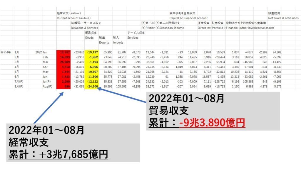上掲の11兆円の貿易赤字というのは、速報値を使ってのことですが、経常収支に直結する国際収支統計の方で見てみましょう。2022年09月の国際収支統計はまだ出ていないので、08月までで見ると、以下のようになります。