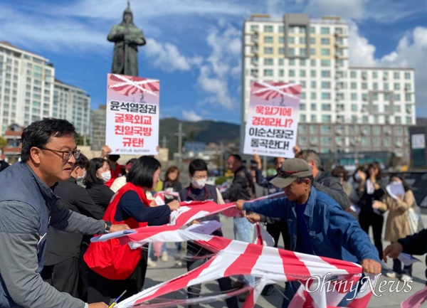 参加者たちは会見文を通じて「政府が来月6日、日本で開かれる日本海上自衛隊創設70周年観艦式に韓国海軍を参加させることにしたと決定した」とし「去る8月から管艦式参加の可否に関する議論が提起されたが、海上自衛隊の旗この「旭日旗と形が違う」と関艦式に参加し、日本海軍との訓練も進行するという」と話した。