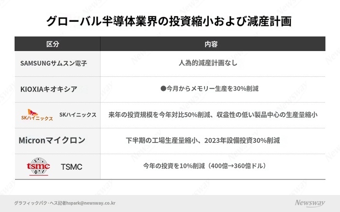 サムスン電子は、需要低迷にもかかわらず、来年は減産計画はないと強調しました。 投資も今年よりも増やすと述べました。 「来年にはデータセンター増設が拡大し、DRAM新モデル採用も増えると見る」として「DRAM中心に下半期に市況が改善されると展望するところもある」と説明しました。 短期的な需要低迷に萎縮せず、中長期的な観点から需要回復に備えるという意味です。