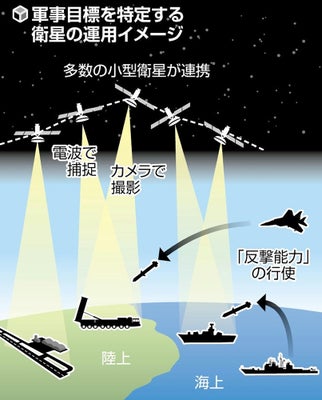 長射程ミサイルの使用が想定される「反撃能力」の行使に際して、地上の軍事施設や海上の艦艇などの位置情報をリアルタイムで把握する必要がある。多数の小型衛星を低高度の周回軌道に打ち上げ、一体的に運用する「衛星コンステレーション」によって、宇宙空間から安定的に目標を把握できる態勢を整える。