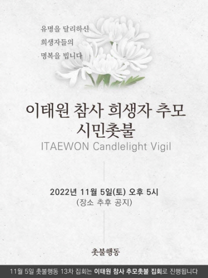 ろうそく行動は31日、ろうそく集会ユーチューブチャンネル「ろうそく前進」に載せた公示を通じて「残念な気持ちを込めて11月5日に予定されていたろうそく行動13次集会を『梨泰院惨事追慕ろうそく集会』で進行する」として「連帯と追慕の心を集めてほしい」と明らかにした。