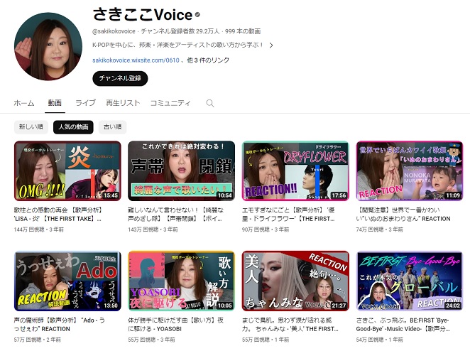「さきここVoice」 ボイストレーナー 動画数約1000 再生総数 8600万回。