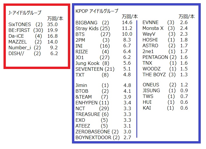 図は、男性グループに限定して、日本の男性アイドルグループとKPOP事務所が絡む男性グループの動画当たりの再生数をグループ/アーティスト別に並べたものだ。
