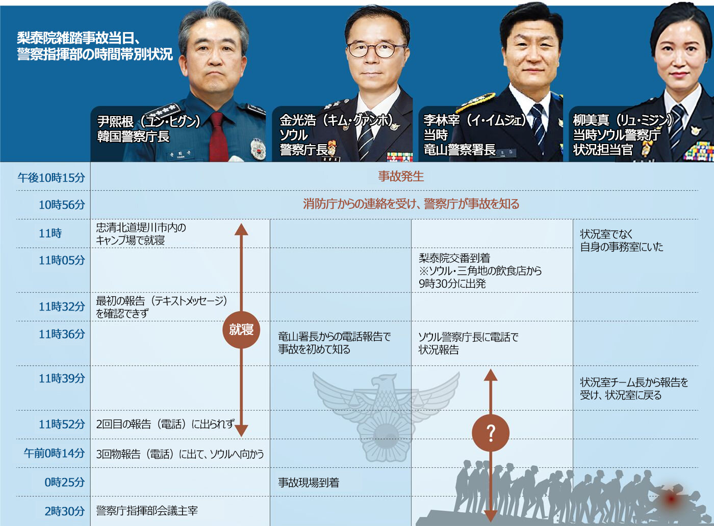 事実、ソウル市竜山区の大統領室近くで待機中だった機動隊1個部隊(60人)を皮切りに、ソウル市内の機動隊部隊が事故現場に本格的に配置され始めたのは、事故発生から1時間15分後の午後11時30分からだった。消防当局の要請からは1時間12分経過していた。それまでは、事故前からもともと予定されていた通り、地下鉄・三角地駅付近のデモ集会対応を終えた機動隊員20人が午後9時30分ごろ現場に投入されただけだった。警察の現状把握と首脳部への報告が遅れ、人員の増員が大幅に遅れたのだ。