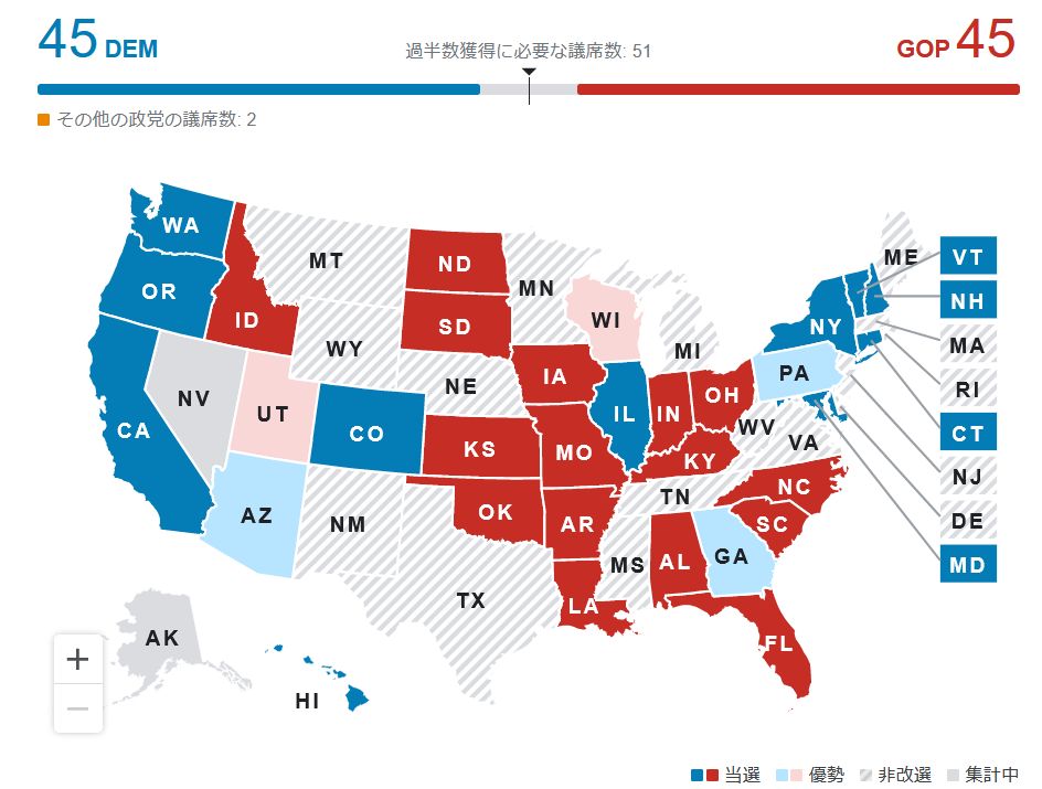 一方、上院は民主党が48議席、共和党が47議席を獲得する見通しで、大接戦となっています。