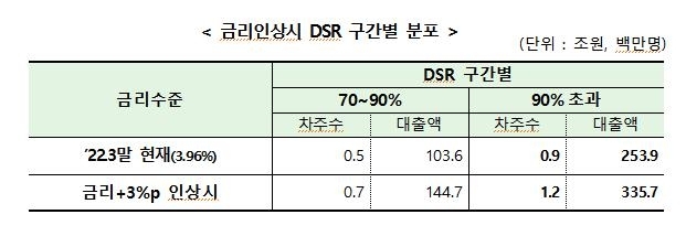 この分析によると、去る3月末90万人だったDSR90%超の貸し手が家計融資平均金利が7%水準になると、120万人に30万人も増える。