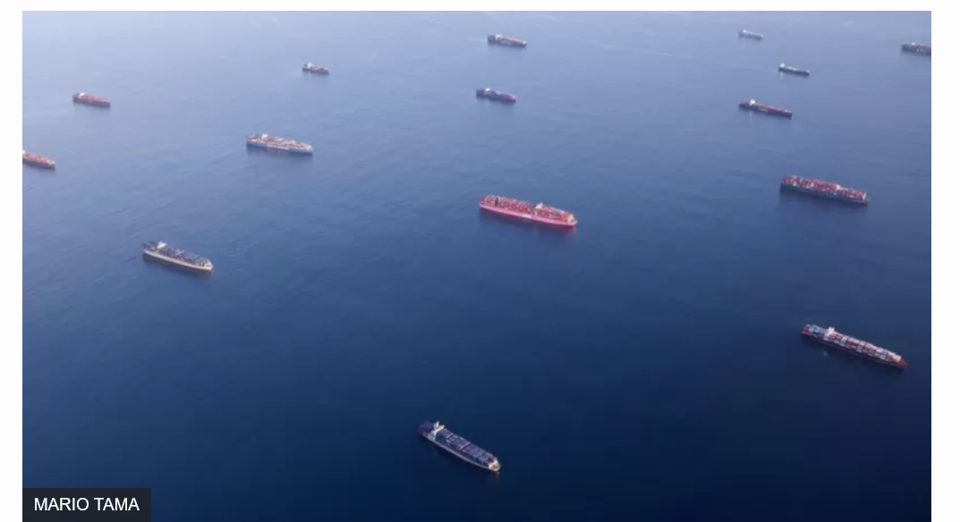 アメリカ沖合で入港待ちしているコンテナ船>>1