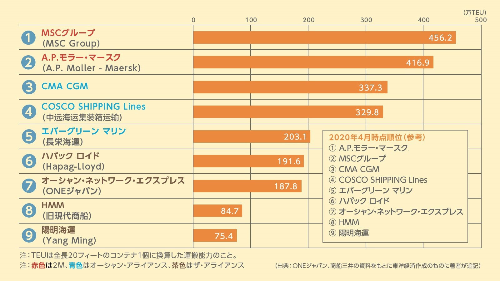 コロナ禍でのコンテナ不足によって、需要がうなぎ上りとなり、コンテナ運賃が急騰し、活況を呈している海運業界。だが、国際競争は激しさを増し、海を越えたアライアンスや経営統合が進んでいる。コンテナ部門ではイタリア発祥のMSC、デンマークのマースクなどの欧州勢が上位を独占する一方で、中国や台湾などアジア勢の追い上げも激しい。その中で、かつて「海運王国」と呼ばれた日本勢も、日本郵船と商船三井、川崎汽船の大手3社がオーシャン・ネットワーク・エクスプレスとしてコンテナ事業を統合するなど合従連衡が進んでいる。- 8