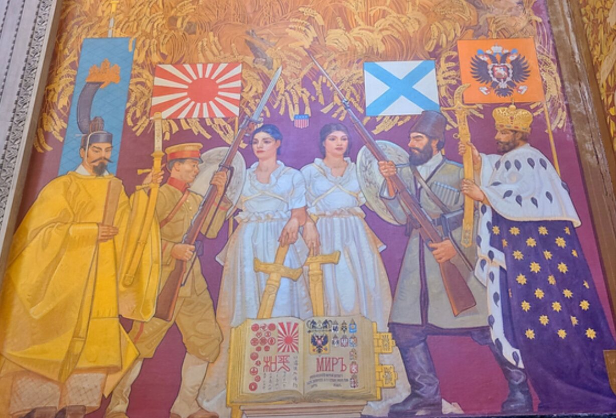 該当壁画は1935年アンドリュー・マッケイ氏が描いたもので、1905年の露日戦争直後、ポーツマス講和会議を斡旋したルーズベルトを表現した。2012年の補修作業後に一般に公開された図で旭日旗について、復旧の過程で描いたのか市民団体の質疑があったが、博物館側は回答しなかった。