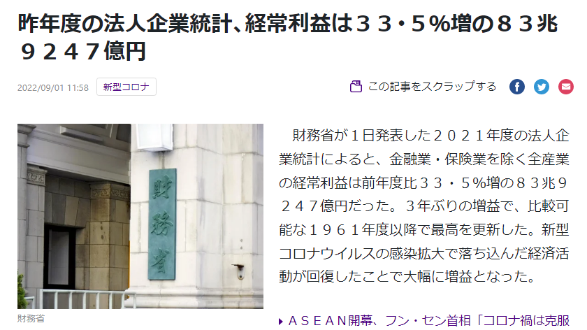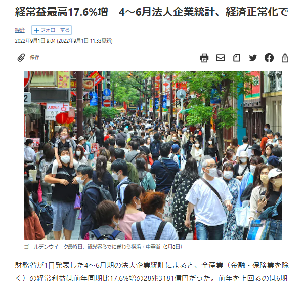 ◆2022年度4~6月期の法人企業統計によると、