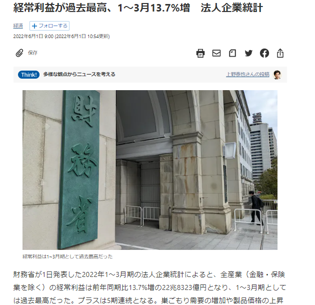 ◆2022年1~3月期の法人企業統計によると、