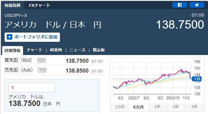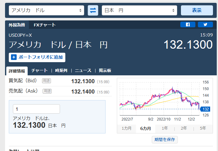 140円台が円高という時代が懐かしい、また150円くらいにならないかな12月21日17時で1ドル132円です