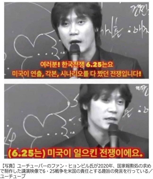 ファン氏は過去の講演で「6・25戦争は米国が演出、脚本、シナリオを全て書いた戦争だ」とし、「6・25戦争は米国が起こした戦争」だと主張した。ファン氏は「戦争が起きる前から米国内では、戦争が起きるとすぐに韓国が一方的に押され、その後済州島から出発し、仁川上陸作戦を行うという筋書きが準備されていた」とも語った。