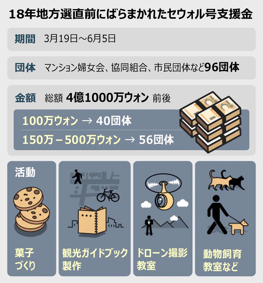 与党国民の力の徐範洙(ソ・ボムス)国会議員が安山市から提出を受けた資料によると、安山市は地方選3カ月前の18年3月19日から投票日8日前の6月5日までの期間に安山市の25の行政洞全地域のマンション婦女会、奉仕組織、協同組合、市民団体など96団体に合計4億1000万ウォン(約4300万円)余りを支給していた。