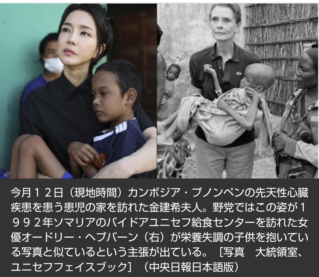 共に民主党が金建希(キム・ゴンヒ)夫人の外見をまた問題視した。今度は金夫人が世界的な映画女優で慈善事業家であるオードリー・ヘプバーンさんを真似したと批判した。尹錫悦(ユン・ソクヨル)大統領の東南アジア歴訪に同行中の金夫人が12日(現地時間)カンボジア・プノンペンの先天性心臓疾患を患うある児童の自宅を訪問して撮影した写真構図と服装に関する主張だ。