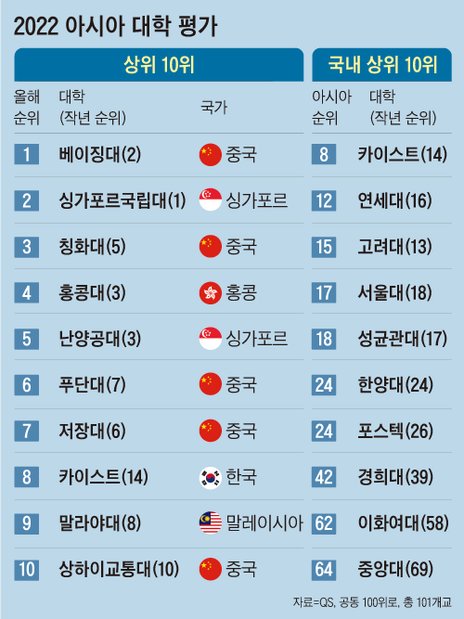 이번 평가에서는 베이징대가 아시아 1위에 올랐고, 이어 싱가포르국립대, 칭화대, 홍콩대, 난양공대가 5위권을 형성했다. 국내 순위는 KAIST가 아시아 8위로 첫 번째로 이름을 올렸고, 연세대(12위), 고려대(15위), 서울대(17위), 성균관대(18위) 순으로 뒤를 이었다.