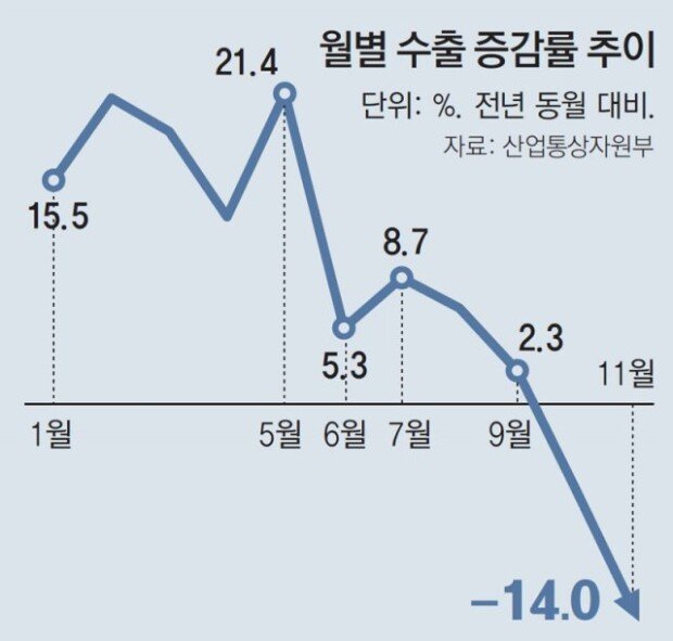 関税庁は21日こうした内容の11月1~20日の輸出入動向資料を発表した。この期間に輸出は332億ドルで前年同期比16.7%減少した。昨年の16.5日から15.5日に減った操業日数を考慮した1日平均輸出額も11.3%減った。輸入は376億ドルで1年前より5.5%減少した