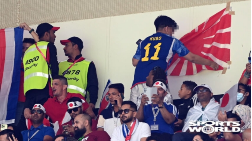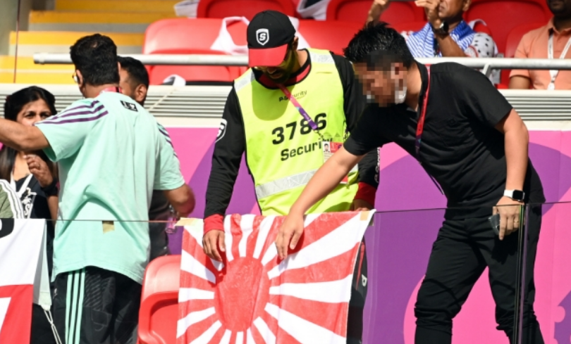 경기장 경찰에 지적되어 제거되는 욱일기