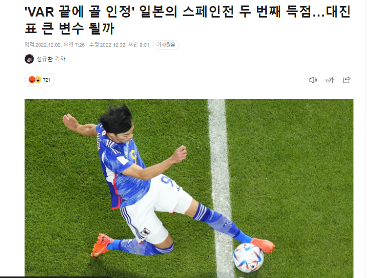 勢いに乗った日本は、3分後にはついに逆転ゴールまで決めた。 図案がペナルティーエリア右からのパスを三苫がつなぎ、田中青がそのまま体で押し込んで得点に成功した。 その後、ミトマがボールを上げる前にラインを越えたかどうかについて、審判たちのビデオ判読(VAR)まで長い時間進められた末、完全には出なかったと判断され、ゴールが認められた。