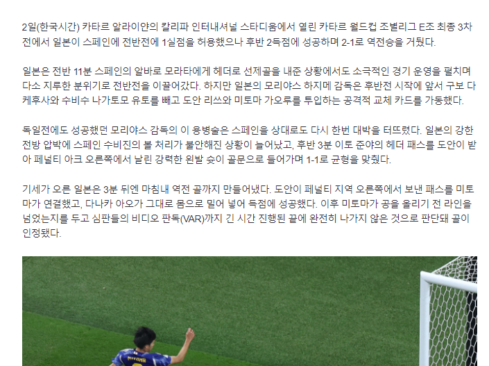 2日(韓国時間)、カタール·アライヤンのカリファ·インターナショナル·スタジアムで行われたカタールW杯1次リーグE組最終第3戦で、日本がスペインに前半戦に1失点を許したが、後半2得点に成功し、2-1で逆転勝ちを収めた。