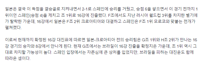 これで現在まで確定した16強の対戦表によると、日本対クロアチア戦の勝利チームはG組1位とH組2位が対戦する16強試合の勝者とベスト8で対戦することになる。 現在、G組ではブラジルが16強進出を確定している中で、組1位もそのまま占める可能性が高い。 スペインとしては自尊心に大きな傷を負ったが、ブラジルを避ける対戦運も一緒についてきたわけだ。過去、ワールドカップにおいては誤審で