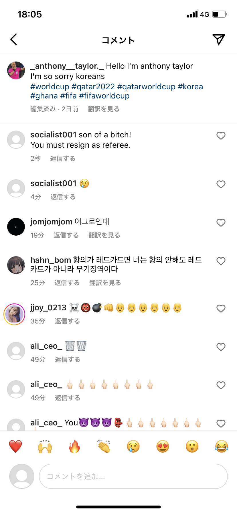 リュ・スンリョンは29日カタールワールドカップグループリーグH組第2戦、大韓民国とガーナの試合で主審を引き受けたアンソニー・テイラー氏のインスタグラムにコメントでタコの絵文字3つを残した。